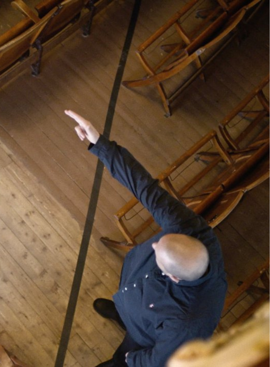 Un monologue est joué dans un bâtiment qui se situe à l’épaisseur d’une frontière, réfléchissant à la façon dont la libre circulation, la libre connaissance et l’espace libre sont menacés.